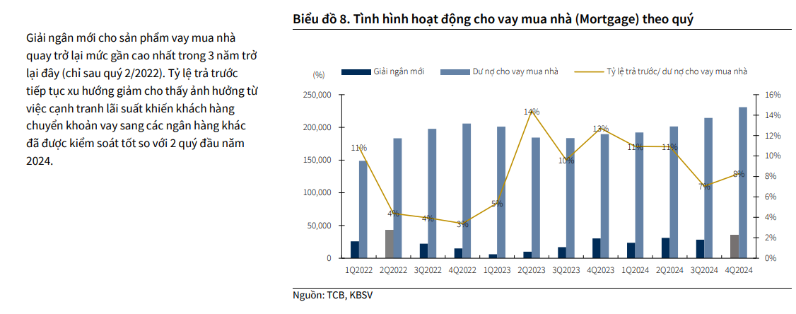Trong năm 2024, dư nợ cho vay mua nhà của TCB tăng 22% YoY sau khi giảm 10% YoY vào năm 2023.