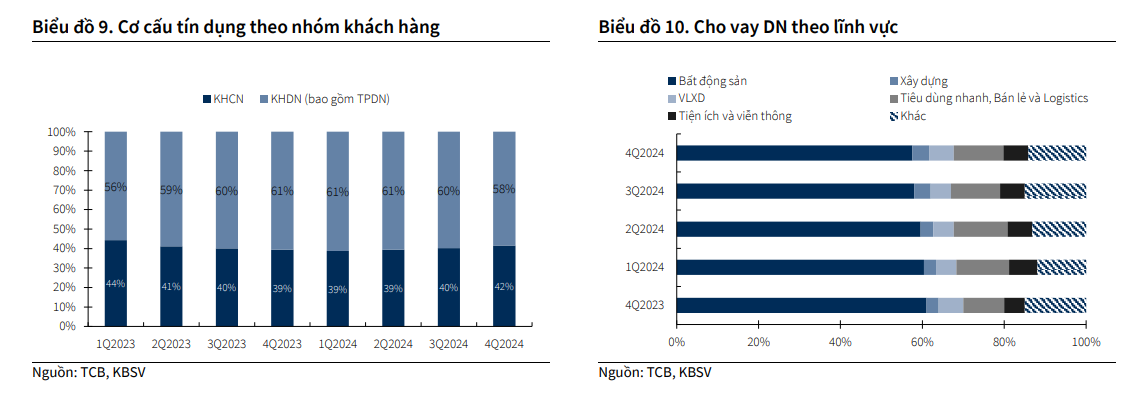 KBSV dự phóng tăng trưởng tín dụng cho năm 2025 của toàn ngân hàng sẽ được duy trì ở mức trên 20%. Thị trường BĐS đang trong chu kỳ hồi phục và các yếu tố hỗ trợ lãi suất, nguồn cung tiếp tục được duy trì, trong thời gian tới sẽ đóng góp vào tăng trưởng tín dụng của TCB.