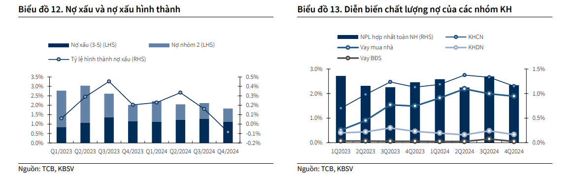 Tỷ lệ nợ xấu hình thành tăng chậm lại kể từ quý 3 và đã bắt đầu giảm trong quý 4 (-0.08%). Tỷ lệ nợ xấu (NPL) cuối năm 2024 là 1.12% (-18bps QoQ), cải thiện ở cả nhóm KHCN và KHDN.