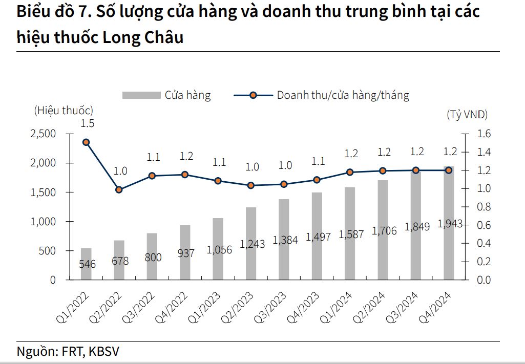 Trong quý 4.2024, chuỗi nhà thuốc Long Châu mang về doanh thu 7,225 tỷ đồng tăng 52.9% YoY, với doanh thu trên cửa hàng đạt trung bình 1.2 tỷ đồng/nhà thuốc/tháng và mở mới 94 hiệu thuốc. LNST của chuỗi ước đạt 116 tỷ đồng, tăng mạnh so với mức âm 15 tỷ VND của cùng kỳ.