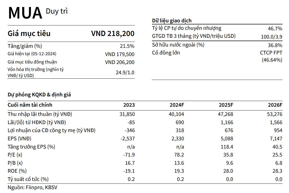 KBSV đưa ra khuyến nghị MUA đối với cổ phiếu FRT cho năm 2025 với giá mục tiêu 218,200VND/cổ phiếu tăng 21.5% so với mức giá ngày 04/03/2025.