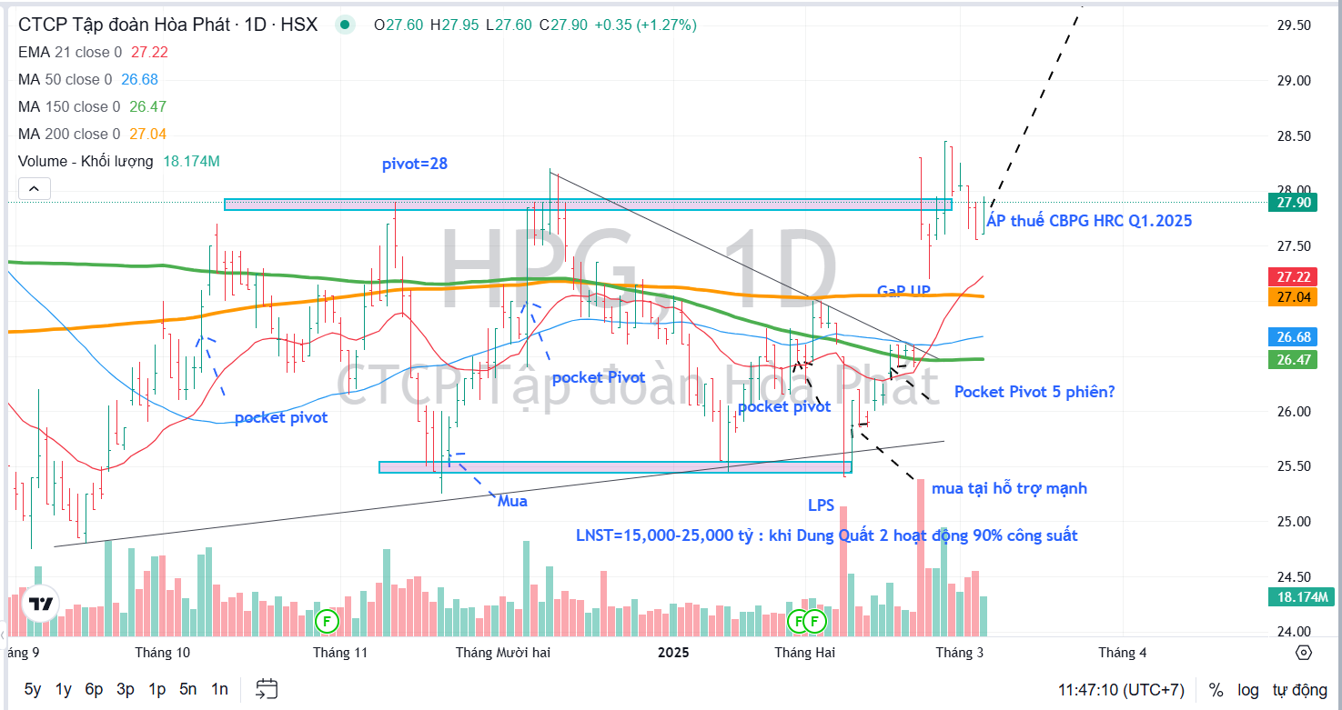 Elibook Team khuyến nghị nắm giữ cổ phiếu HPG sau khi đã mua tích lũy từ tháng 10.2024, các điểm mua cổ phiếu này là dưới <28,000.