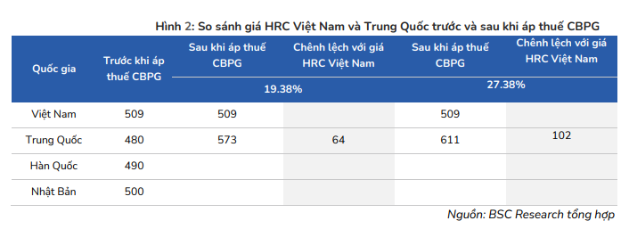 Theo đó, sau khi áp thuế, BSC ước tính giá HRC của Trung Quốc nhập vào Việt Nam sẽ ở mức 575 – 615 USD/tấn – cao hơn 64-102 USD so với giá HRC của HPG. Sức ép cạnh tranh với HRC Trung Quốc hạ nhiệt sẽ tạo cơ hội cho HPG tăng giá thép.