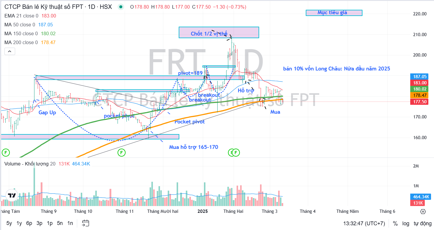 Elibook Team khuyến nghị vẫn tiếp tục nắm giữ cổ phiếu FRT sau khi đã khóa một nửa lợi nhuận +7%. Hiện FRT đang tìm kiếm hỗ trợ quanh MA200 ngày. Đây là lần thứ hai cổ phiếu này kiểm tra đường trung bình di động quan trọng này.