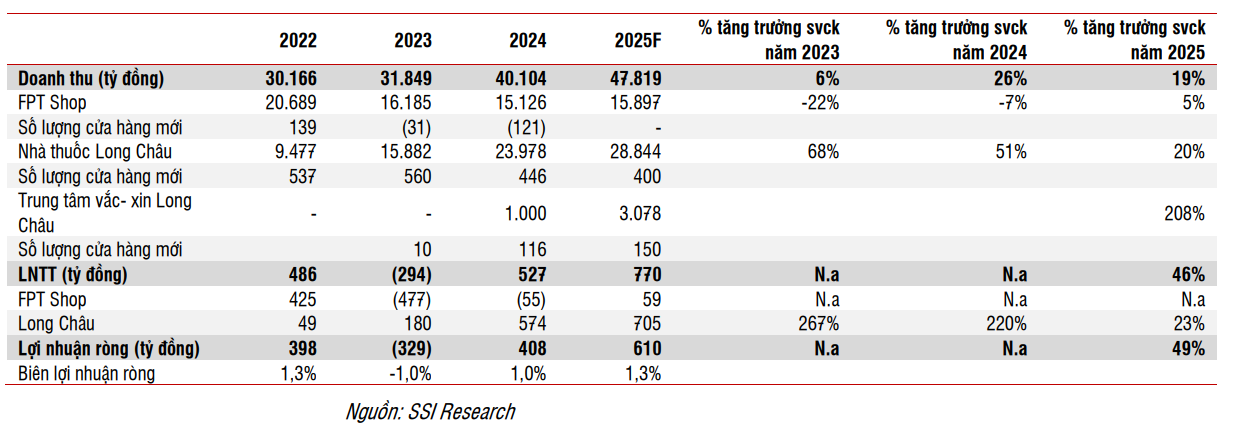 Sau khi phục hồi trong năm 2024, SSI Research kỳ vọng đà tăng trưởng lợi nhuận của FRT sẽ tiếp tục trong năm 2025, phần lớn nhờ chu kỳ thay mới điện thoại và mở rộng mạng lưới nhà thuốc Long Châu. SSI tăng ước tính lợi nhuận ròng năm 2025 lên 610 tỷ đồng (+49% svck, từ 529 tỷ đồng) do kết quả kinh doanh Q4/2024 tốt hơn dự kiến.