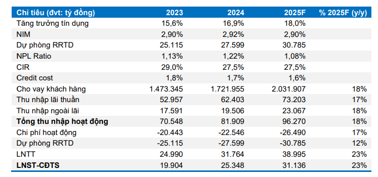 Năm 2025 BVSC dự báo tăng trưởng tín dụng sẽ đạt 18%. Trong đó, động lực chính đến từ mảng mảng KHCN, KHDN và FDI tăng lần lượt 20%, 17% và 20% y/y. Mảng cho vay KHDN vừa và nhỏ (SME) dự báo tăng 15% y/y.