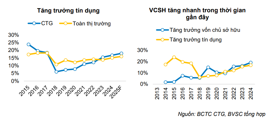 Việc CTG giảm chia cổ tức bằng tiền mặt, dự kiến tăng vốn thông qua chia cổ tức bằng cổ phiếu giúp VCSH tăng với tốc độ 15-17%/năm. Điều này giúp CTG duy trì tốc độ tăng trưởng tín dụng