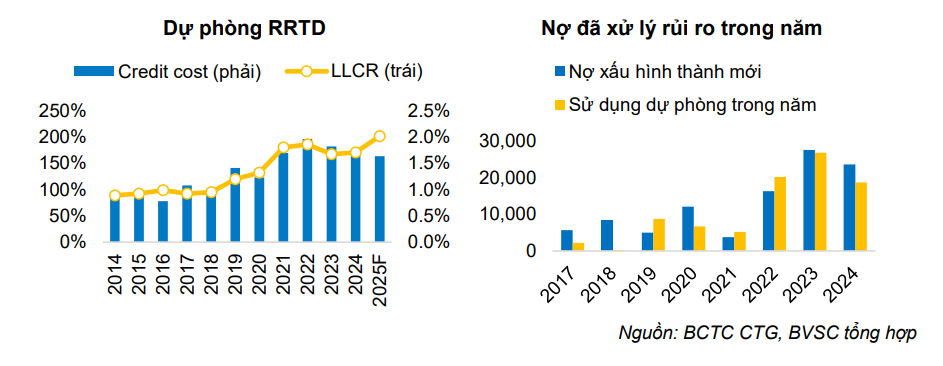Sau giai đoạn đẩy mạnh trích lập dự phòng RRTD, CTG đã xây dựng bộ đệm dự phòng (LLCR) ở mức 170.7% cuối năm 2024. Với tỷ lệ nợ xấu hình thành mới dự báo tiếp tục giảm trong 2024, BVSC kỳ vọng CTG sẽ giảm chi phí trích lập dự phòng RRTD xuống 1.6% và đồng thời tăng LLCR lên 204%.