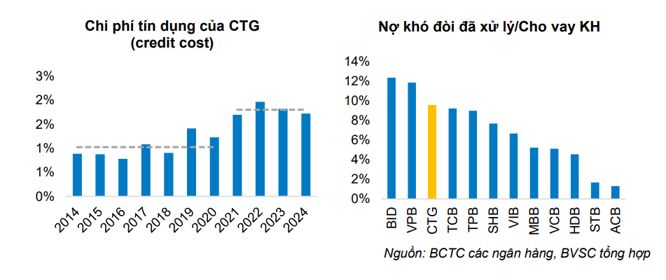 BVSC (13.3.2025) dự phóng tổng thu nhập hoạt động (TOI) và LNST – CĐTS của CTG đạt lần lượt 96,270 tỷ đồng (+18% y/y) và 31,136 tỷ đồng (+23% y/y) trong năm 2025. Động lực tăng trưởng chính: (1) Tăng trưởng tín dụng ở mức 18%; (2) Thu nhập ngoài lãi cải thiện do tăng thu nhập từ hoạt động dịch vụ và thu hồi nợ xử lý rủi ro; và (3) Credit cost giảm xuống 1.6%