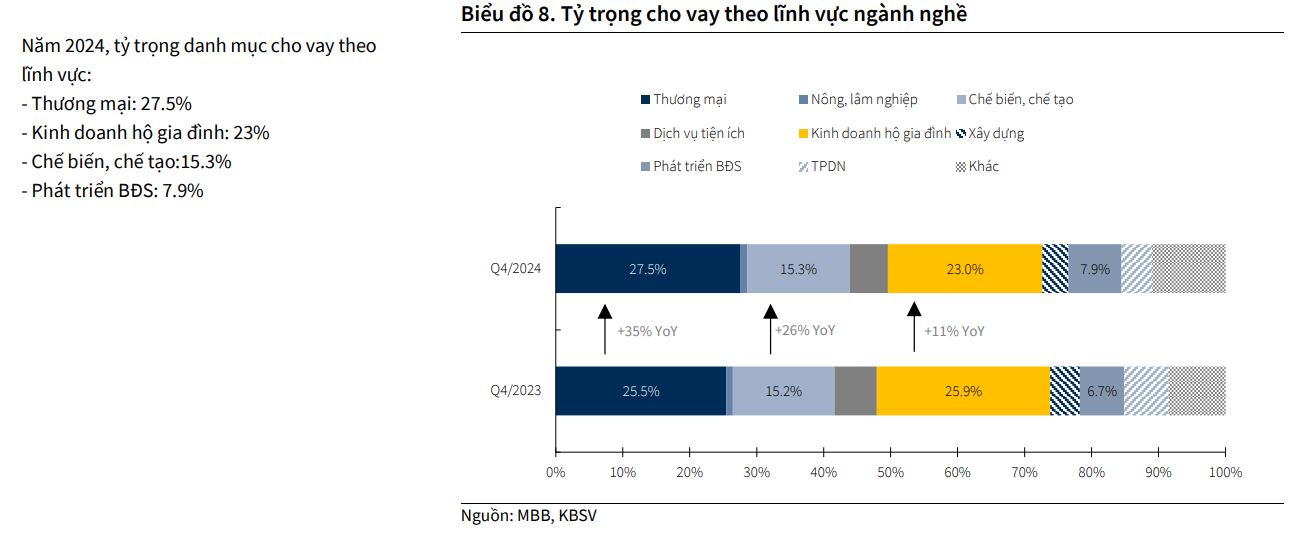 KBSV kỳ vọng MBB sẽ tiếp tục duy trì mức tăng trưởng tín dụng cao (trên 20%) trong giai đoạn 2025-2027. MBB sẽ tiếp tục phát huy lợi thế sẵn có để đẩy mạnh tín dụng vào các lĩnh vực chiếm tỷ trọng lớn trong danh mục cho vay như thương mại, chế biến chế tạo, kinh doanh hộ gia đình và phát triển bất động sản – những ngành đóng vai trò quan trọng trong chu kỳ phục hồi kinh tế.