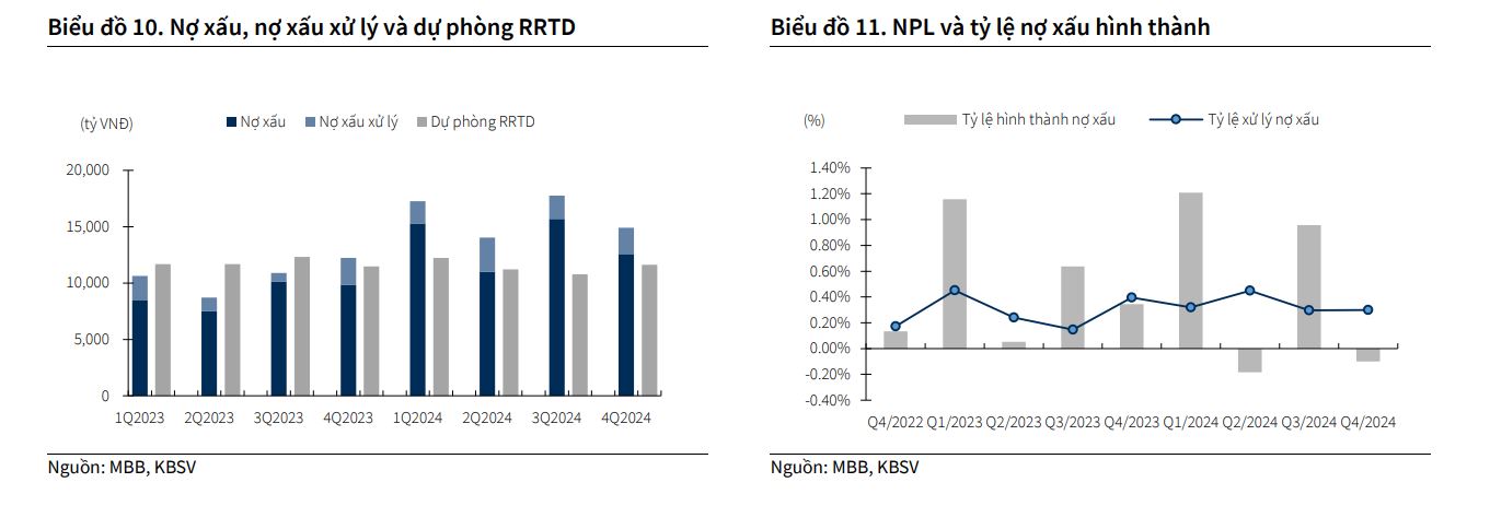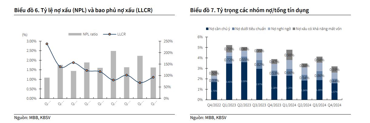 KBSV cho rằng vấn đề chất lượng tài sản của MBB không còn là mối quan ngại trọng yếu như giai đoạn trước. Dự kiến trong năm 2025, MBB sẽ tiếp tục kiểm soát NPL <1.7% nhờ vào (1) đà phục hồi kinh tế giúp cải thiện năng lực tài chính của khách hàng; (2) tháo gỡ pháp lý cho một số dự án lớn mà MBB tài trợ (liên quan đến nhóm KH Novaland, Trung Nam); (3) tăng trưởng lợi nhuận tích cực giúp ngân hàng có thêm dư địa để củng cố bộ đệm dự phòng.