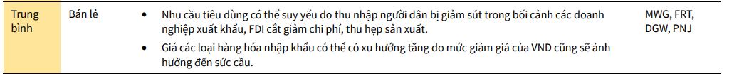 Theo đánh giá của CTCK KBSV (5.4.2025), nhóm bán lẻ bị ảnh hưởng ở mức độ trung bình bởi cuộc chiến thuế quan. Đây là những ảnh hưởng gián tiếp do thu nhập của người dân bị giảm sút và giá nhập khẩu các mặt hàng ICT có thể tăng do VND mất giá.