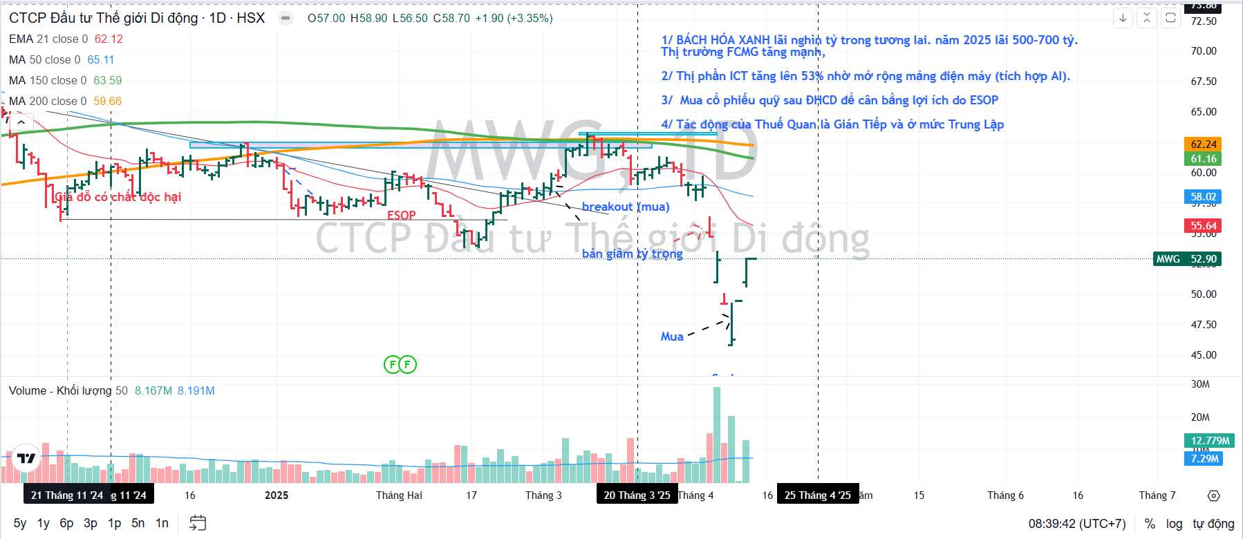 Elibook Team đã khuyến nghị mua trở lại MWG vào ngày 9.4.2025 sau khi giảm tỷ trọng vào ngày 3.4.2025 bởi tác động của cuộc chiến thuế quan. Chúng tôi vẫn duy trì việc nắm giữ vị thế ở cổ phiếu MWG.