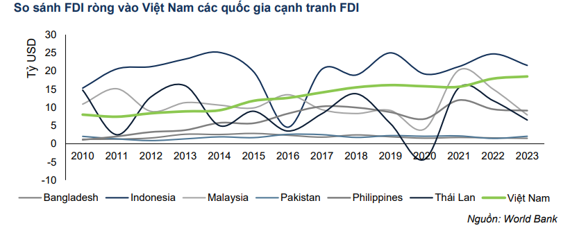 Trong dài hạn, kỳ vọng dòng vốn FDI giải ngân có thể phục hồi và được bù đắp bởi các doanh nghiệp FDI nhắm đến thị trường xuất khẩu ngoài Mỹ, nhờ Việt Nam vẫn duy trì lợi thế về lực lượng nhân công giá rẻ, vị trí thuận lợi cho việc giao thương, các chính sách thu hút vốn FDI…