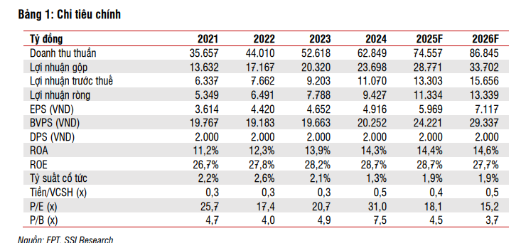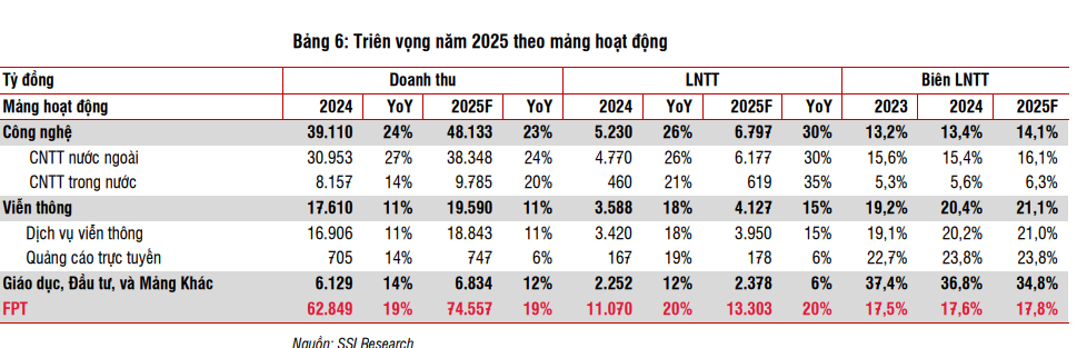SSI kỳ vọng doanh thu đạt 74,600 tỷ đồng (+18% svck) và lợi nhuận sau thuế thuộc cổ đông công ty mẹ (NPATMI) đạt 9,500 tỷ đồng (+21% svck), chủ yếu nhờ mảng công nghệ (gần như không đổi so với ước tính trước ).