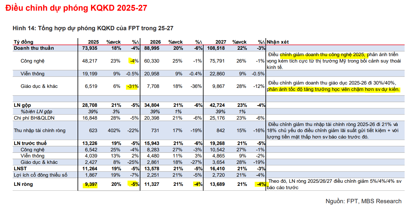 Nhìn chung, SSI (17/4/2025) giữ nguyên mọi dự báo tăng trưởng lợi nhuận của FPT, nhưng điều chỉnh giảm hệ số P/E mục tiêu cho mảng công nghệ và giáo dục xuống 20x và mảng viễn thông xuống 14x, tương đương với hệ số P/E của các công ty cùng ngành, do bất ổn tăng cao đối với triển vọng trung hạn.