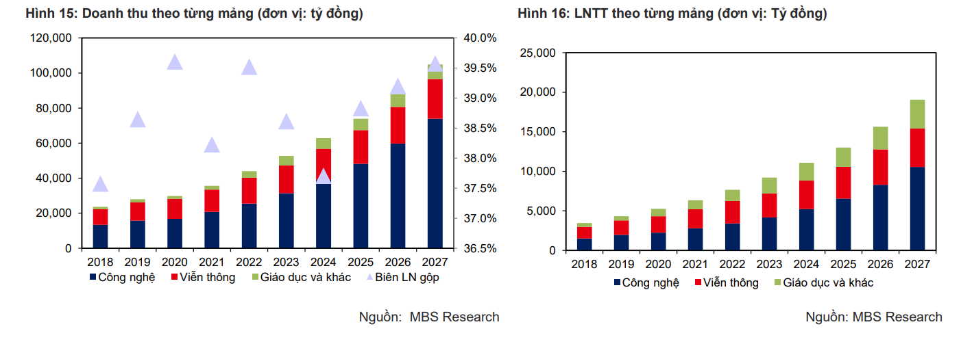 Nhìn sang 2026-27, nhờ tiếp tục đẩy mạnh đầu tư mở rộng nhanh mạng lưới các trường K-12 tích hợp tại nhiều tỉnh thành, cộng với triển khai thêm các chương trình đào tạo mới về ngành bán dẫn sẽ là bàn đạp thúc đẩy tăng trưởng học viên mới theo học các chương trình của FPT. Dự kiến doanh thu mảng 2026-27 tăng 18% svck và 28% svck, LNTT theo đó tăng tương ứng 18% svck và 28% svck