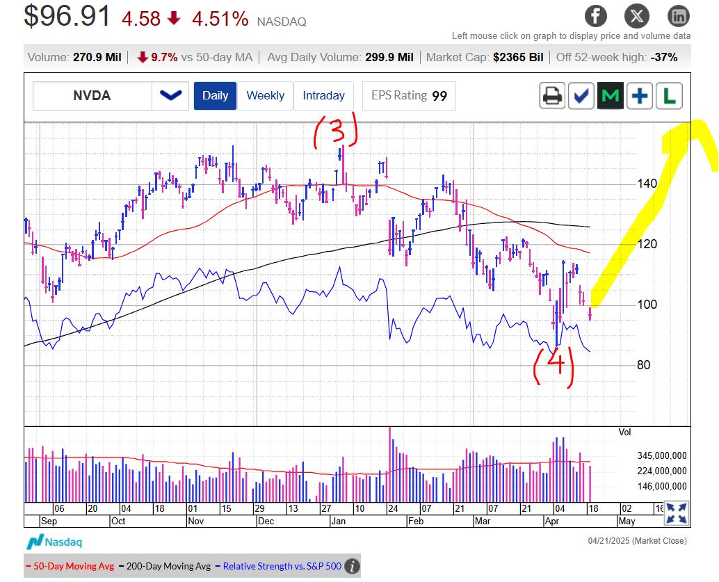 Bình luận của admin: Dưới góc nhìn sóng Elliott, admin cho rằng, cổ phiếu NVIDA đang điều chỉnh theo sóng (4) và có thể nó đã tạo đáy vào ngày 9.4.2025. Chúng tôi kỳ vọng NVDA sẽ tăng giá trở lại nhờ FED bơm thanh khoản vào thị trường và sức mạnh thu nhập của công ty rất vượt trội.