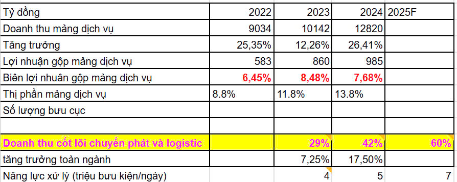 Elibook dự báo tốc độ tăng trưởng doanh thu mảng cốt lõi (chuyển phát và logistic) sẽ tăng trưởng nhanh lên đến 60%. Thị phần của công ty có thể nâng lên mức 15%, từ mức 13.8% của năm 2024.