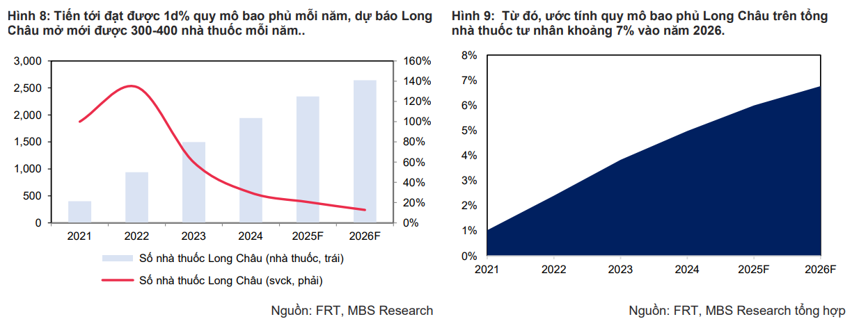 Sự lạc quan này đến từ việc điều chỉnh tăng số lượng cửa hàng 2025 thêm 12% so với dự phóng trước, lên 400 cửa hàng, tương ứng mức tăng trưởng 21% trong năm 2025. Hiện độ phủ về số lượng của hàng Long Châu trong tổng quy mô thị trường chỉ đạt khoảng 6% trong năm 2025. Với vị thế dẫn đầu, Long Châu hoàn toàn tiếp tục mở mới 300 cửa hàng trong năm 2026. Dư địa mở rộng khi độ phủ về số lượng cửa hàng trong tổng quy mô thị trường chưa đạt tới con số 10%.
