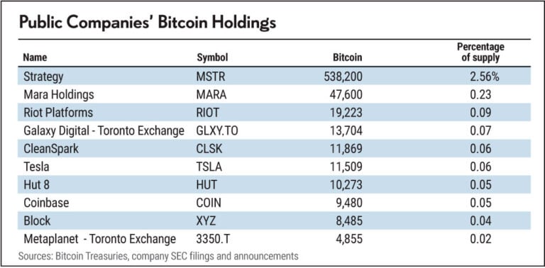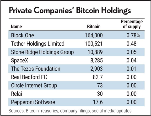 Các công ty đại chúng nắm giữ khoảng 3.35% tổng nguồn cung, trong khi các công ty tư nhân nắm giữ 1.37%, theo dữ liệu của Bitcoin Treasuries.