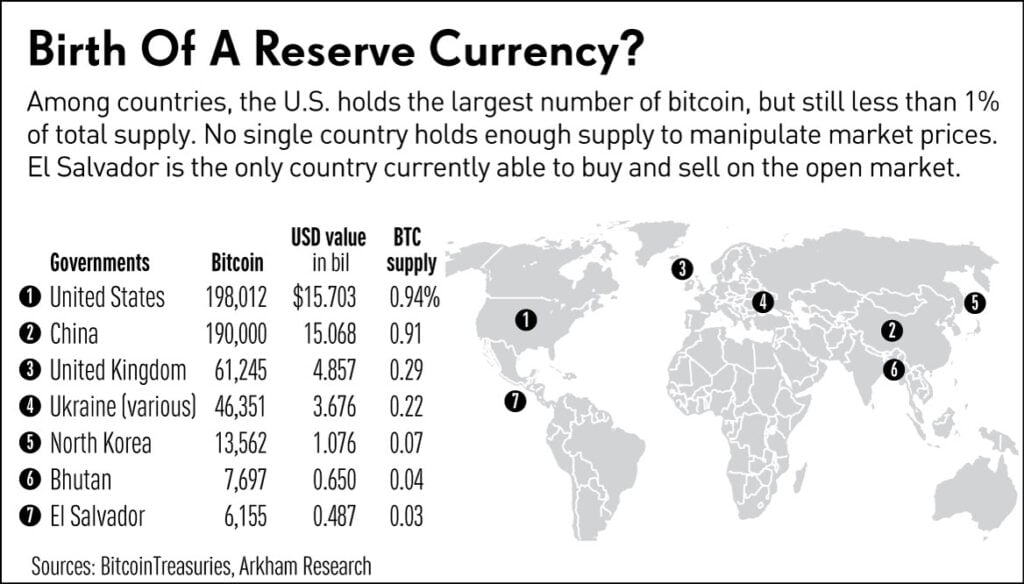 Hoa Kỳ là quốc gia nắm giữ nhiều nhất với khoảng 198,000 bitcoin tính đến giữa tháng Tư, theo dữ liệu của Bitcoin Treasuries. Trung Quốc đứng thứ hai với khoảng 190,000 bitcoin, tiếp theo là Vương quốc Anh với 61,245 và Ukraine với hơn 46,000.