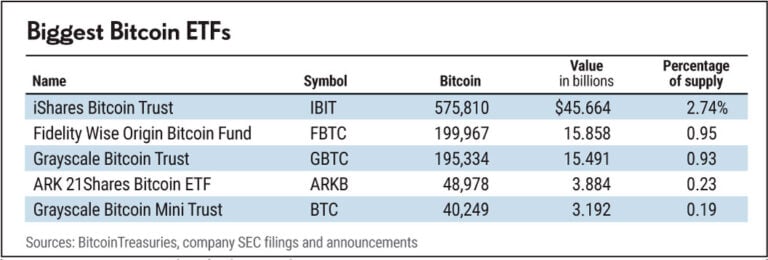 Trong số các công ty tư nhân, Block.one nắm giữ lượng bitcoin lớn nhất. Những người mua lớn khác bao gồm các quỹ ETF bitcoin, vốn đã rất thành công kể từ khi được phê duyệt và ra mắt vào tháng 1 năm 2024. Lớn nhất trong số đó, iShares Bitcoin Trust (IBIT), báo cáo một lượng bitcoin thậm chí còn lớn hơn của Strategy.