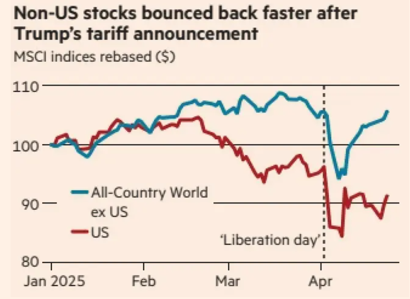 S&P 500 đã giảm tới 12% trong tuần sau tuyên bố thuế quan “ngày giải phóng” của Trump vào ngày 2 tháng 4. Mặc dù sau đó đã phục hồi phần lớn khoản lỗ này khi Trump đảo ngược hoặc trì hoãn một số thuế quan, nhưng nó vẫn tụt hậu xa so với các đối thủ như Hang Seng của Hồng Kông hoặc Stoxx Europe 600.