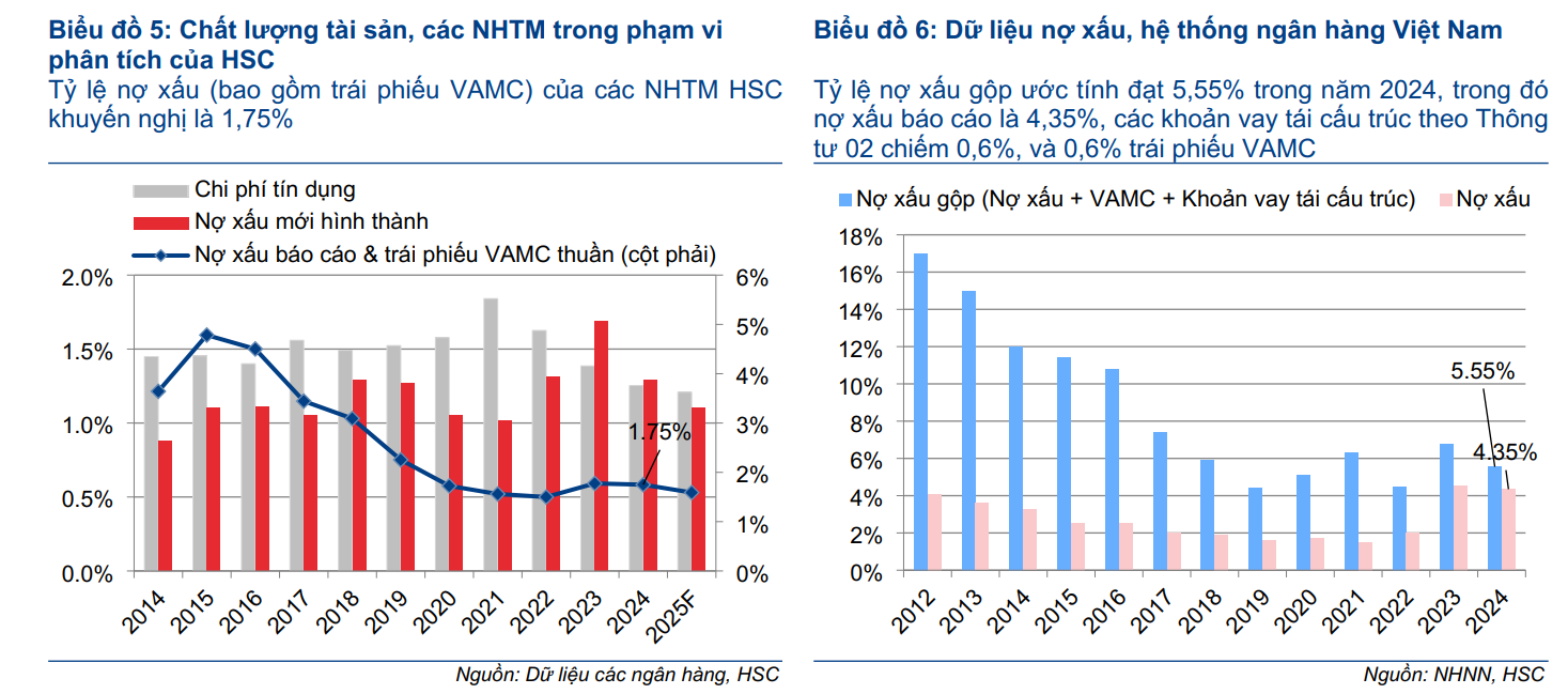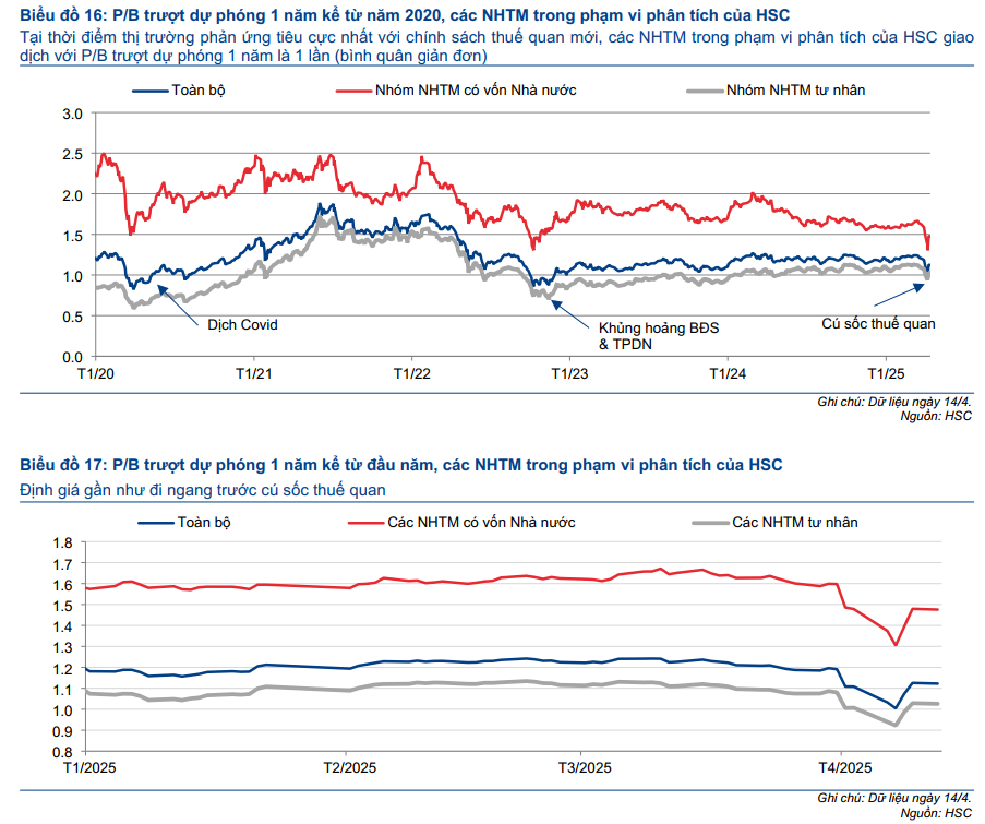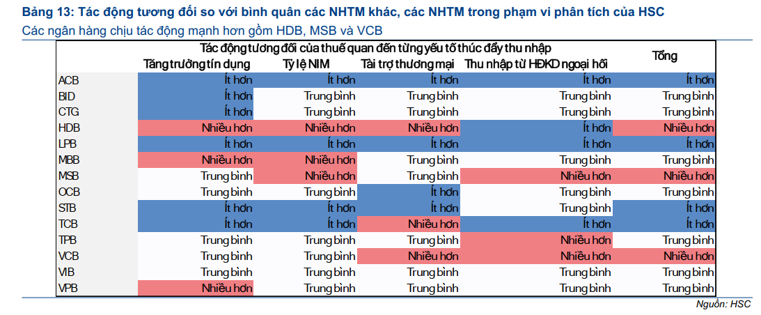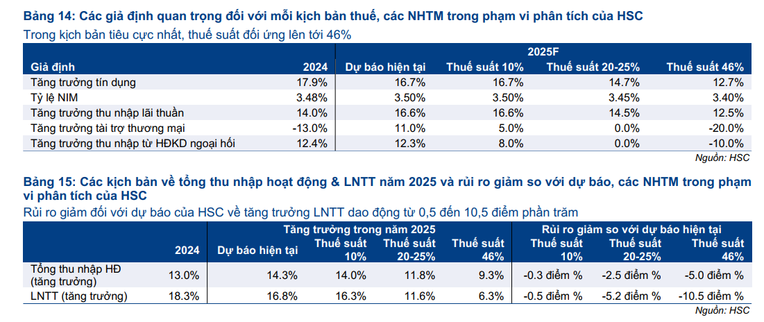 Tác động tổng thể của các mức thuế do ông Trump đề xuất lên các ngân hàng Việt Nam là “gián tiếp: nhưng “tiêu cực ở mức độ vừa phải”. Trong ngắn hạn, mối quan ngại chính nằm ở áp lực lên doanh thu do nhu cầu tín dụng yếu hơn, khả năng NIM bị thu hẹp, và thu nhập từ ngoại hối cũng như tài trợ thương mại giảm sút. HSC đánh giá suy giảm chất lượng tài sản là rủi ro có tính trung dài hạn. Các NHTM chịu ảnh hưởng nhẹ hơn bao gồm ACB, LPB, STB, TCB trong khi các NHTM chịu ảnh hưởng lớn hơn bao gồm HDB, MSB và VCB.