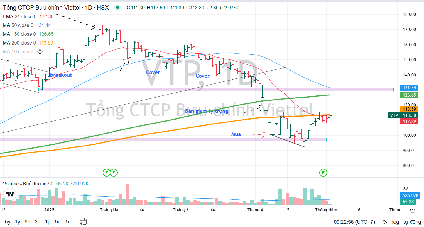 Elibook Team vẫn đang nắm giữ cổ phiếu VTP đã mua hồi tháng 9.2024, ở vùng giá 7x. Dấu hiệu phân kỳ dương giữa giá và RSI vào ngày 22.4.2025 cho thấy đáy đã thiết lập. Kỳ vọng VTP hướng về MA50 ngày ở vùng giá 130,000 đồng.