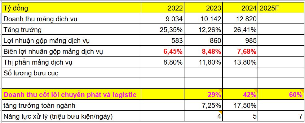Chúng tôi ước tính doanh thu cốt lõi chuyển phát và logistic trong quý 1 tăng hơn 30% yoy, và thường tăng trưởng sẽ cao hơn vào các quý cuối năm. Nhìn về năm 2025, Elibook Team kỳ vọng tăng trưởng doanh thu cốt lõi mảng chuyển phát và logistic của VTP là trên 60%, gấp đôi so với kế hoạch 30% ban lãnh đạo đưa ra.
