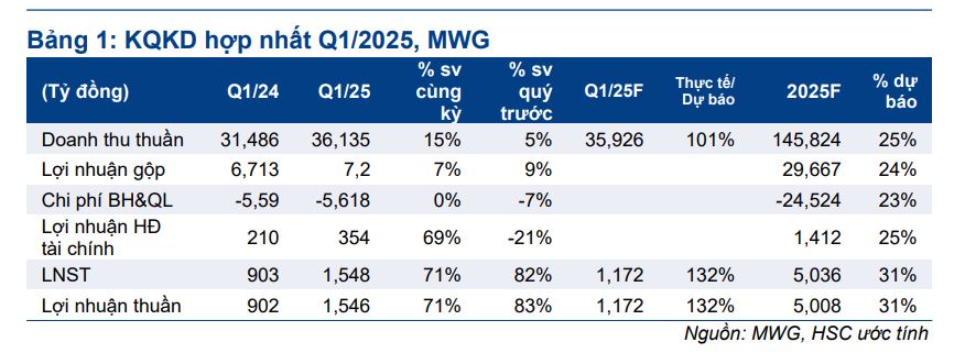 Kết quả kinh doanh quý 1/2025 của MWG đã được công bố và cho thấy sự tăng trưởng vượt trội so với dự báo của HSC.
