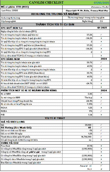 Bảng CANSLIM checklist chot hấy STB đỗ nhiều tiêu chí quan trọng. Trong 3 quý gần nhất, STB đều có tốc độ tăng trưởng lợi nhuận hai con số lớn là: +35%; +39% và +38% yoy. Đồng thời, STB đã có 3 năm tăng tốc trong tăng trưởng lợi nhuận với hai con số lớn là +48%, +53% và +31% yoy.