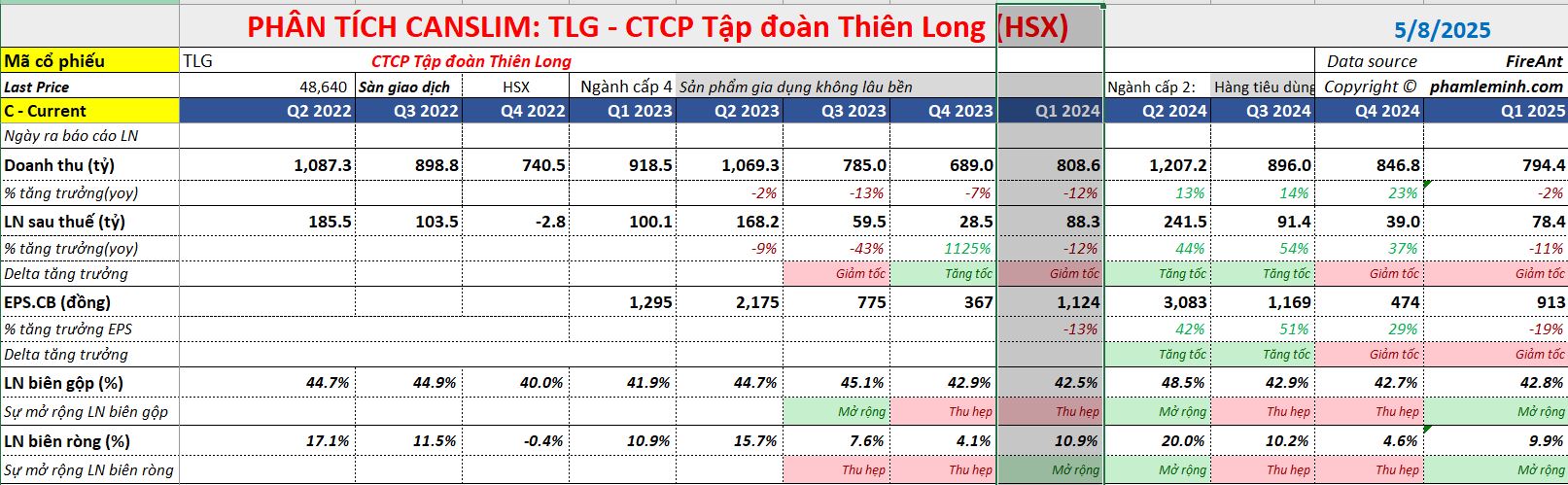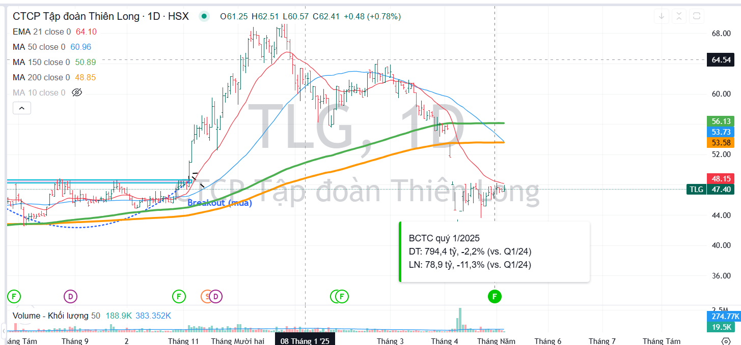 Elibook Team cho rằng, kết quả kinh doanh quý 1.2025 kém hơn một chút so với kỳ vọng là do ảnh hưởng của các yếu tố bên ngoài như động đất tại Myanmar hay cuộc chiến tranh thương mại của Mỹ. Theo dữ liệu của Vietcap, 64% LNST của TLG tập trung vào quý 2 và quý 3. Do đó, Elibook Team cho rằng, ảnh hưởng ở đây chủ yếu là do yếu tố mùa vụ. Thời điểm kinh doanh chính của TLG là trước thời điểm tựu trường.