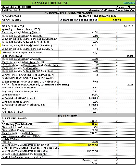 Đường RS (Sức Mạnh Giá Tương Đối) của TLG hiện chỉ là 16 điểm, cho thấy cổ phiếu hoạt động kém trên thị trường. Bảng CANSLIM Checklist cho thấy TLG không đáp ứng tiêu chí cổ phiếu tăng trưởng ở thời điểm hiện tại.