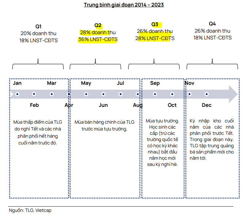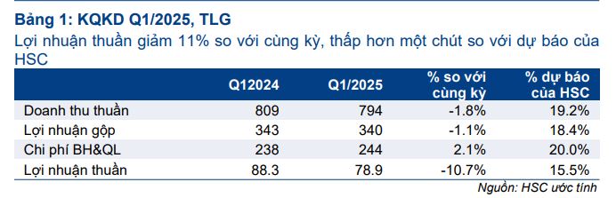 Trong khi đó, Vietcap lưu ý rằng quý 1 thường là mùa thấp điểm của TLG, với trung bình hoàn thành 20% doanh thu và 18% LNST sau lợi ích CĐTS cả năm. Do đó, mức hoàn thành 15% mục tiêu LNST của quý 1.2025 chỉ thấp hơn một chút so với bình quân lịch sử.