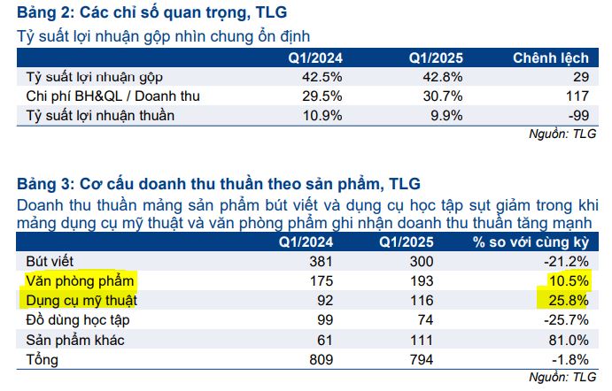 CTCP Tập đoàn Thiên Long (TLG) vừa công bố kết quả kinh doanh quý 1/2025 với doanh thu thuần đạt 794 tỷ đồng (-2% yoy) và lợi nhuận ròng đạt 79 tỷ đồng (-11% yoy). Kết quả này thấp hơn một chút so với dự báo trước đó của HSC (87 tỷ đồng) và cũng thấp hơn kỳ vọng của Vietcap do doanh số bán hàng tại các thị trường yếu hơn dự kiến. Ban lãnh đạo công ty giải thích rằng sự sụt giảm này phần lớn do sự gián đoạn ngắn hạn gây ra bởi trận động đất ở Myanmar.