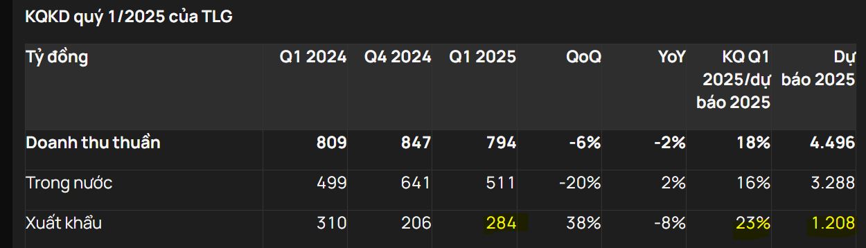Doanh thu từ thị trường xuất khẩu của TLG giảm 10% yoy, đạt 284 tỷ đồng.