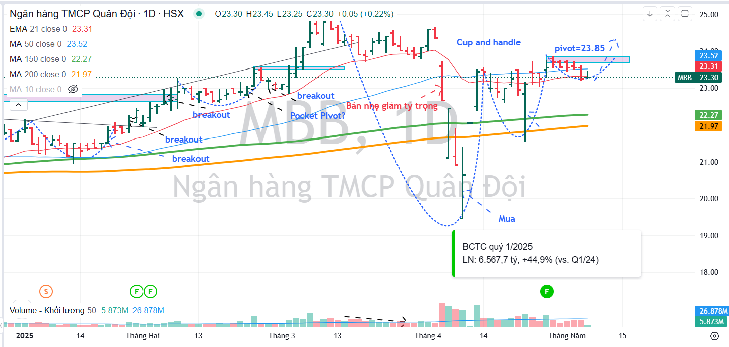 Elibook tiếp tục khuyến nghị nắm giữ cổ phiếu MBB và chờ đợi điểm breakout mẫu hình Chiếc Cốc Tay Cầm. RS (Sức Mạnh Giá Tương Đối) của MBB là 83, nằm trong số các cổ phiếu hoạt động tốt trên thị trường.