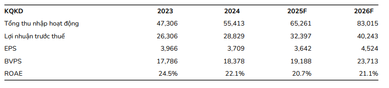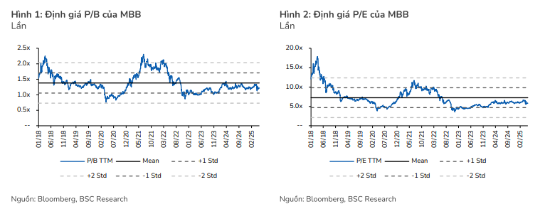 BSC (7.5.2025) đưa ra khuyến nghị MUA cho MBB với giá mục tiêu gần nhất là 28,200 đồng/cp. BSC dự báo LNTT hợp nhất của ngân hàng đạt 32,400 tỷ (+12% YoY), nhỉnh hơn kế hoạch trình ĐHCĐ là 31,700 tỷ (+10% YoY).