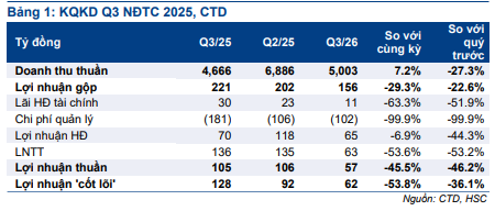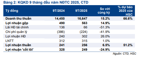 Kết quả kinh doanh quý này của CTD thấp hơn nhiều so với dự báo của Công ty Chứng khoán HSC, đặc biệt là lợi nhuận ròng từ hoạt động kinh doanh cốt lõi.