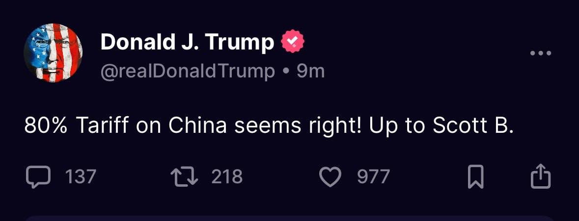 Trong một bài đăng trên mạng xã hội Truth Social của mình, tổng thống gợi ý rằng Mỹ có thể giảm gần một nửa thuế quan đối với hàng hóa Trung Quốc, hiện đang ở mức 145%, đồng thời kêu gọi Bắc Kinh mở cửa thị trường cho các sản phẩm của Mỹ. “Thuế quan 80% đối với Trung Quốc có vẻ hợp lý! Tùy thuộc vào Scott B.”, ông nói, ám chỉ cuộc gặp ở Geneva giữa Bộ Trưởng Tài Chính Mỹ Scott Bessent và Phó Thủ Tướng Trung Quốc Hà Lập Phong.