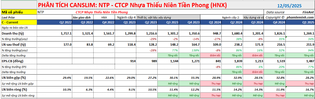 Cổ phiếu NTP đỗ nhiều tiêu chí CANSLIM cho một cổ phiếu tăng trưởng. Trong 3 năm gần nhất, tăng trưởng lợi nhuận ròng của NTP cũng tăng tốc lần lượt là +3%, +17% và +32% yoy.