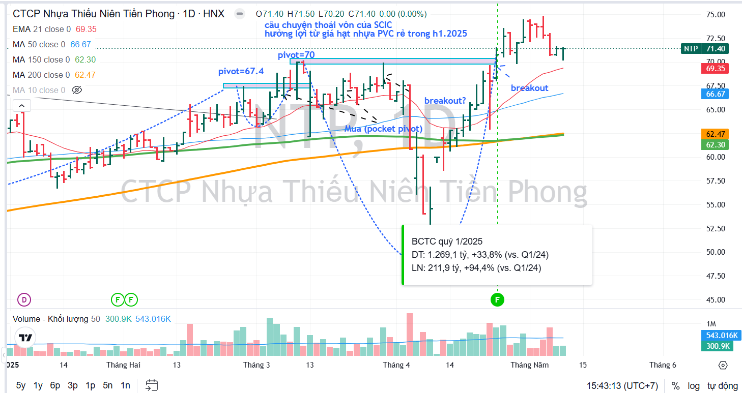 Trên đồ thị, RS của NTP là 90, nằm trong số các cổ phiếu hoạt động tốt nhất trên thị trường. Sau khi breakout Chiếc Cốc ở điểm mua 70,000 đồng, NTP đang kiểm tra lại EMA 21 ngày mở ra cơ hội mua bổ sung.