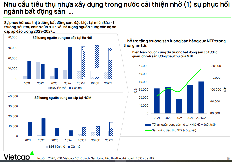 Theo đánh giá của Vietcap, nhu cầu tiêu thụ nhựa xây dựng dự kiến sẽ tiếp tục được cải thiện đáng kể trong năm 2025 nhờ hai yếu tố chính: