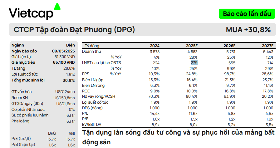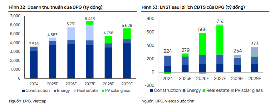 Vietcap đánh giá cao DPG nhờ sự kết hợp độc đáo giữa vai trò là một nhà thầu cầu đường mới nổi, hưởng lợi từ chi tiêu hạ tầng tăng cao, và nguồn lợi nhuận ổn định từ mảng thủy điện. Bên cạnh đó, quỹ đất bất động sản rộng lớn (khoảng 210 ha) và dự án sản xuất kính PV đầy tiềm năng cũng được xem là những động lực tăng trưởng dài hạn của DPG.