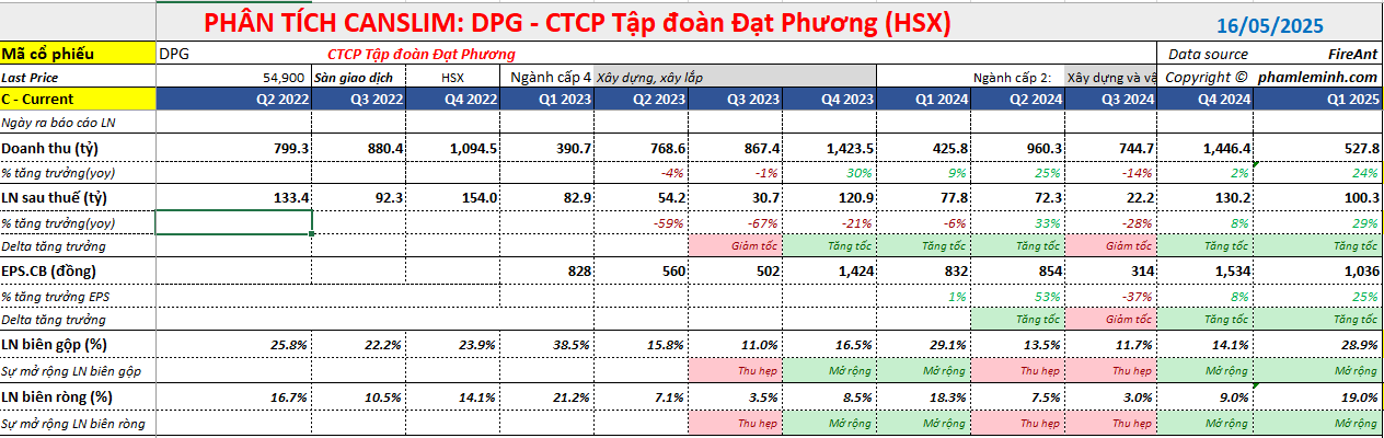 Trong quý 1.2025, lợi nhuận sau thuế đạt 100 tỷ đồng, tăng 29%. Đây là mức lợi nhuận sau thuế quý I cao nhất của DPG trong ba năm trở lại đây. Đo dó, DPG có mẫu hình Code 33. Theo đó, tốc độ tăng trưởng doanh thu lần lượt là -14%, +2% và +24% yoy; tương ứng tốc độ tăng trưởng lợi nhuận sau thuế là: -28%, +8% và +29% yoy. Đồng thời biên lợi nhuận ròng mở rộng từ 3% lên 19%.