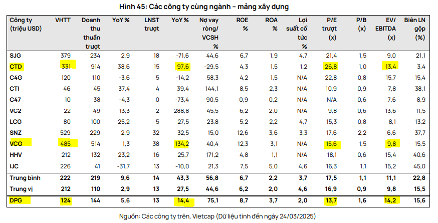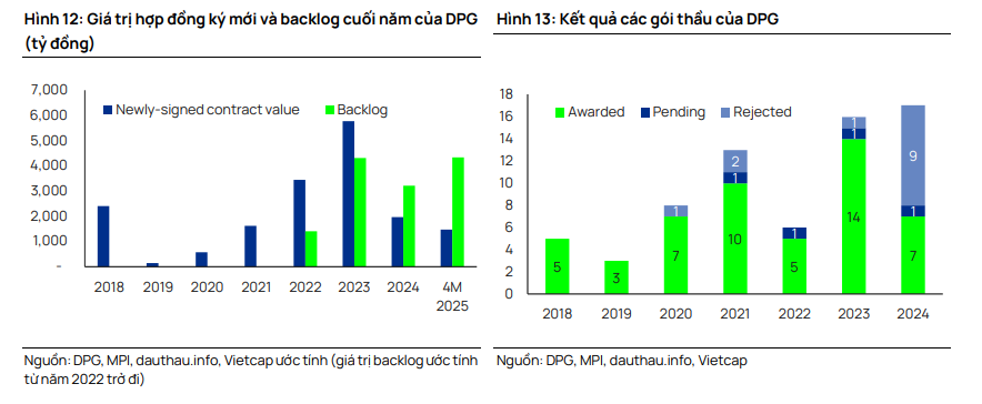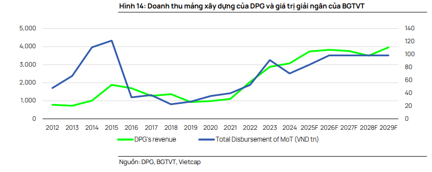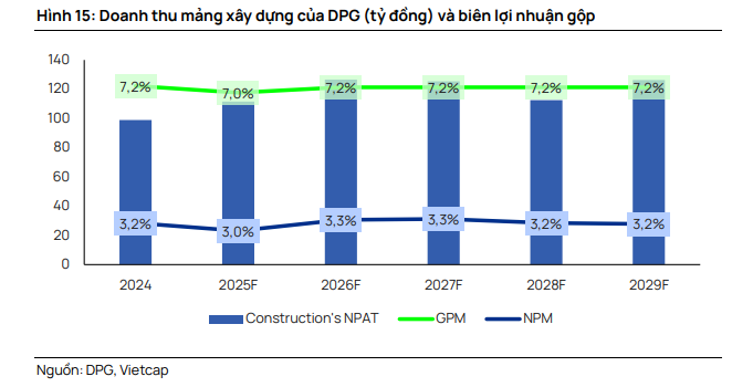 Vietcap dự báo doanh thu mảng xây dựng của DPG sẽ đạt 3,700 tỷ đồng trong năm 2025 (+21% YoY), kéo theo LNST sau lợi ích CĐTS đạt 107 tỷ đồng (+9% YoY). Phần lớn mức tăng trưởng này đến từ việc ghi nhận doanh thu từ các hợp đồng đã ký trong năm 2023,cùng với một số hợp đồng ngắn hạn được ký trong giai đoạn nửa đầu năm 2024.