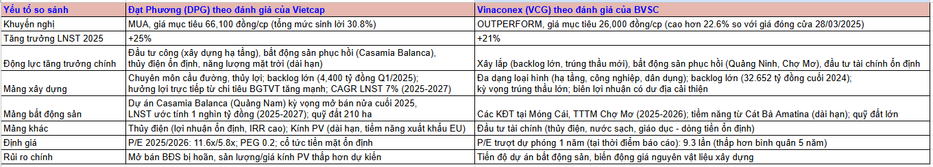 - Lĩnh vực xây dựng: DPG có thế mạnh rõ rệt trong lĩnh vực cầu đường và thủy lợi, hưởng lợi trực tiếp từ kế hoạch tăng chi tiêu của Bộ Giao thông Vận tải. VCG có năng lực xây dựng đa dạng hơn, bao gồm cả dân dụng, công nghiệp và hạ tầng.