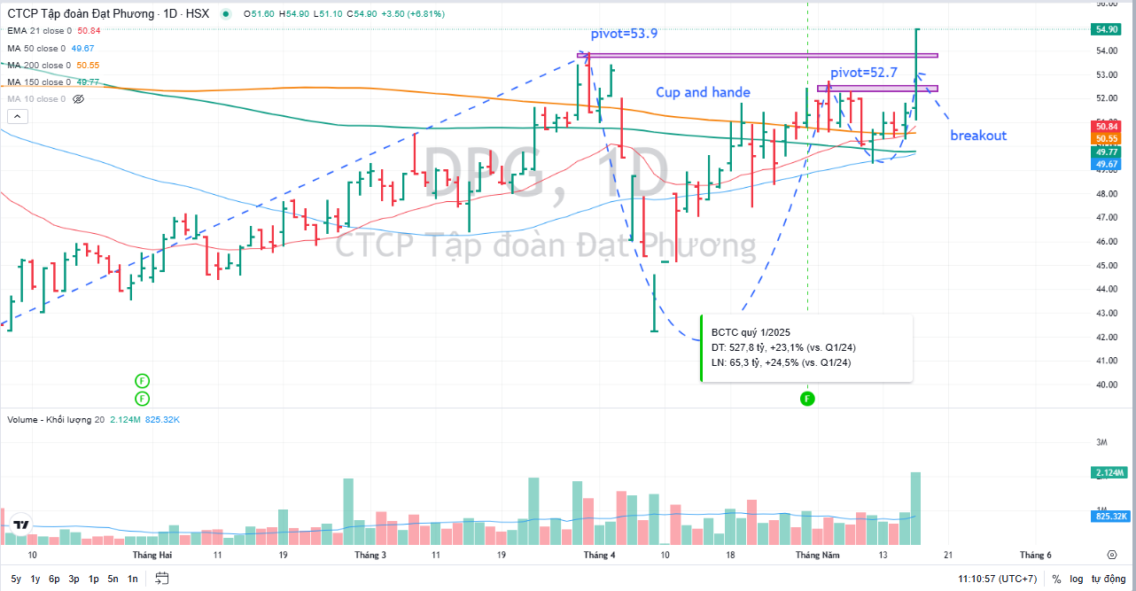 Trên đồ thị, DPG đang có RS=76, hoạt động ở mức trung bình trên thị trường. Tuy nhiên, ngày 16.5.2025, DPG breakout mẫu hình Chiếc Cốc Tay Cầm. Đây là hành động giá cho thấy sóng ngành đầu tư công đang dần xuất hiện. Ngày 15.5.2025, VCG cũng breakout đường trendline bên trong mẫu hình Chiếc Cốc Tay Cầm tạo điểm mua sớm.